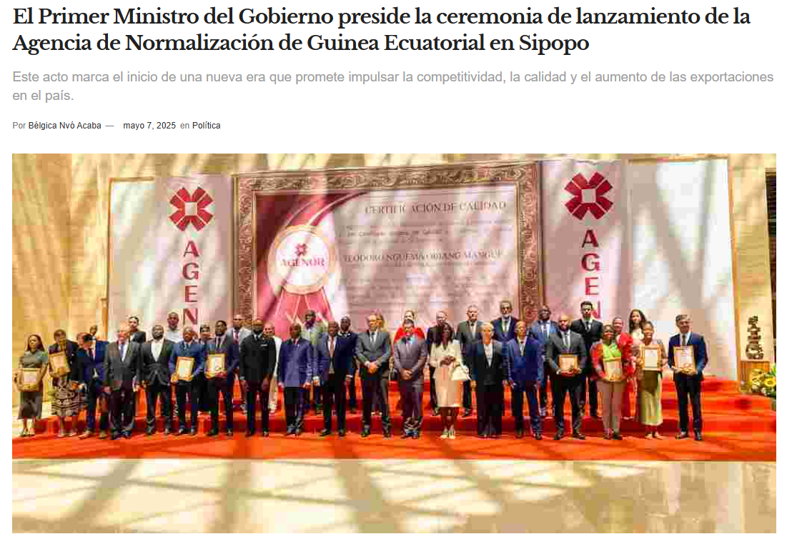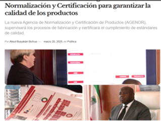 La Agencia de Normalización de Guinea Ecuatorial (AGENOR) inicia oficialmente sus actividades en el territorio nacional con un paso firme hacia el fortalecimiento institucional en materia de normalización, certificación y calidad, elementos clave para el desarrollo socioeconómico sostenible, la protección del consumidor y la competitividad de los sectores productivos. Este acto marca el inicio de una nueva etapa para el país en materia de calidad, normativas técnicas y desarrollo institucional. Invitamos a nuestros socios, instituciones públicas, privadas y al público en general, a acompañarnos en este firme compromiso con la excelencia y la modernización de Guinea Ecuatorial.
